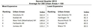 C2ER recently released the second quarter 2012 results. Table 1 presents their list of the most expensive and least expensive urban areas in which to live in the United States. In Table 2, we provide data for the most expensive and least expensive areas to purchase groceries.