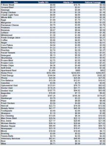 First, we start with a base salary of $45,000 after taxes; an equivalent salary in Atlanta would be approximately $38,130 after taxes. From Table 3 one can see that the most significant difference in moving from Seattle to Atlanta is the decrease in the price of housing (-33.60%), followed by a decrease in healthcare (-14.30%), groceries ( 4.25%), and transportation (-4.21%), while utility expenses would typically increase (+5.19%).