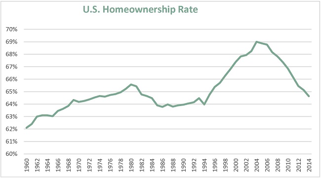 Another factor to consider is whether there might be a natural equilibrium point for homeownership. Considering the chart below of historical homeownership rates in the United States, if we were to look for a sustainable homeownership rate, we might postulate that it would be somewhere around 64%. And since the U.S. Census Bureau’s Housing Vacancies and Homeownership (CPS/HVS) for third quarter 2014 showed a national homeownership rate of 64.4%, perhaps we are approaching a point of stability, though we suspect the homeownership rate is going to drop a bit further before it stabilizes.