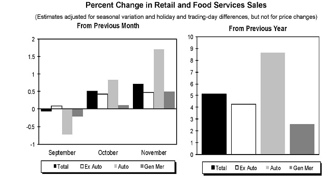 On December 11, the U.S. Census Bureau announced that advance sales estimates of U.S. retail and food services for November 2014, adjusted for seasonal variation and holiday and trading-day differences but not for price changes, were $449.3 billion, up 5.1% from November 2013. Retail sales were up 4.9%, motor vehicle sales were up 9.5%, and nonstore retailer sales were up 8.7% from last November, while gas station sales were down 2.1% over the same period.