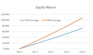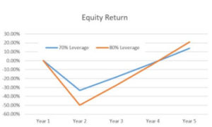 Cash-on-cash return favors 70% leverage, due to the lower debt service burden. However, in a positive-growth scenario, the 80% leverage situation catches up after year 5. As far as equity return is concerned, it is hands-down an 80% leverage race, with much steeper increases from the start.